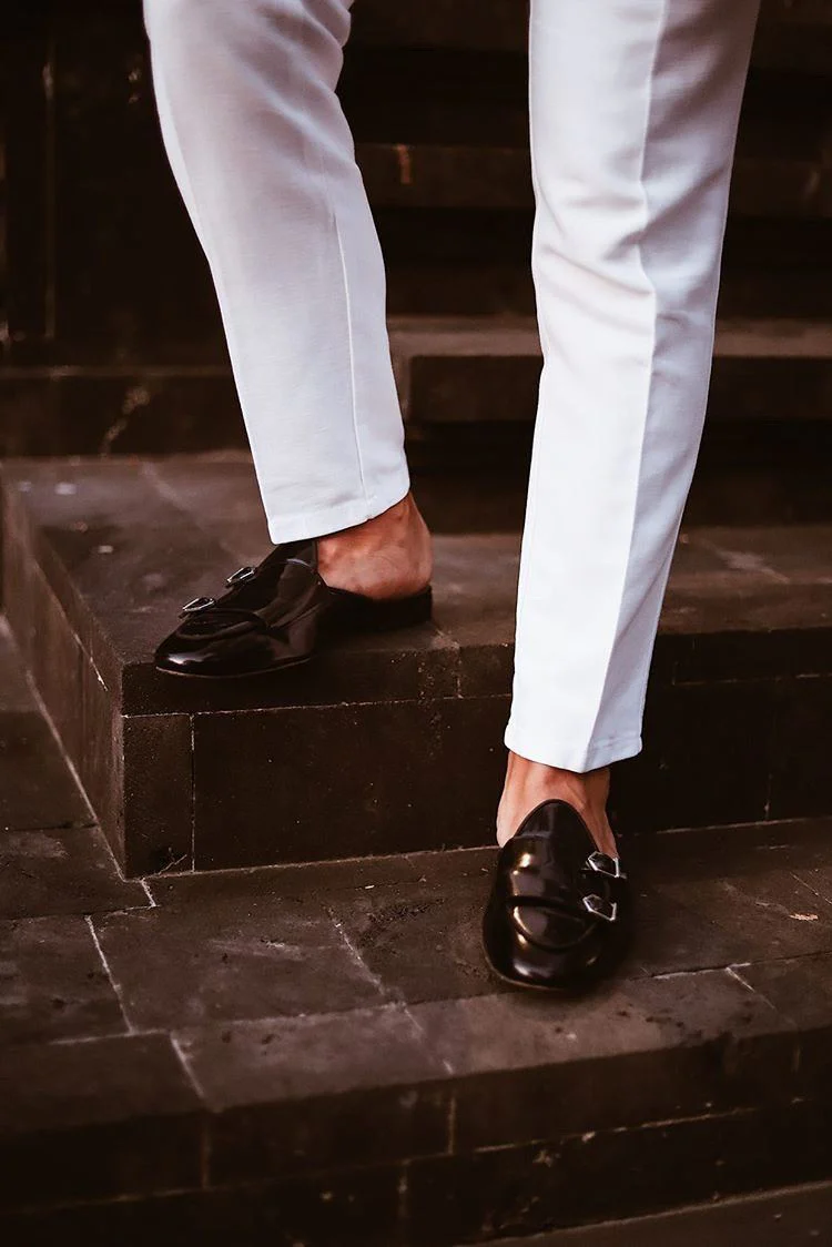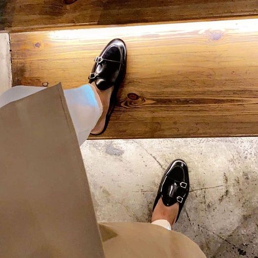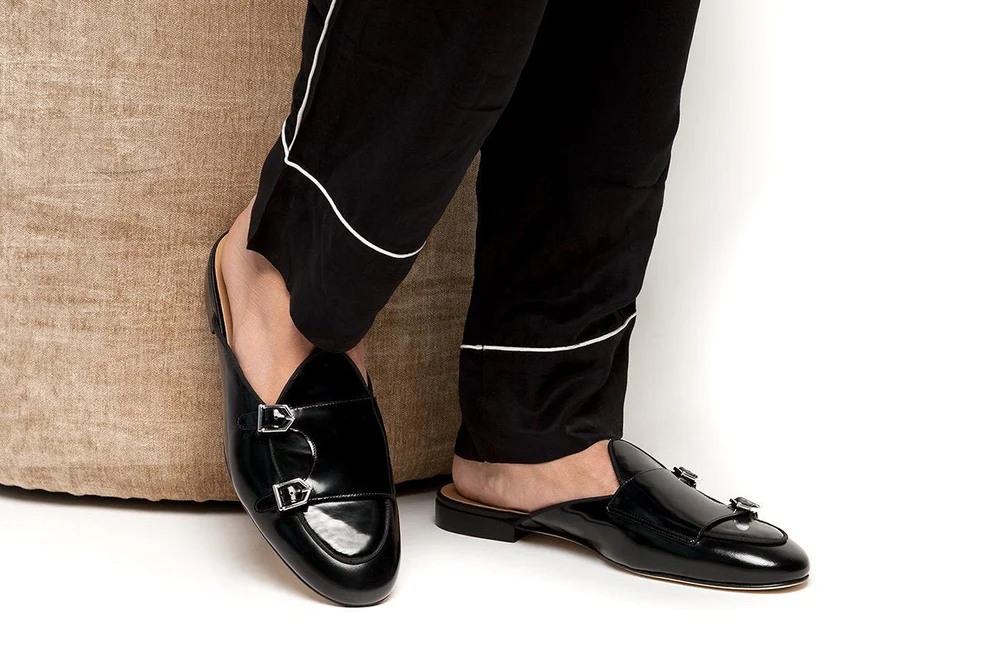 Dark brown hand-polished calfskin Belgian style double-monk mules with ton-sur-ton Gros-grain piping and golden metal buckles