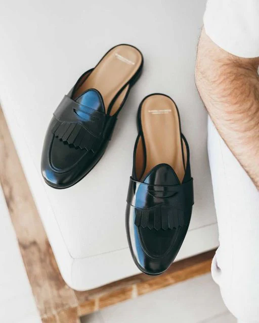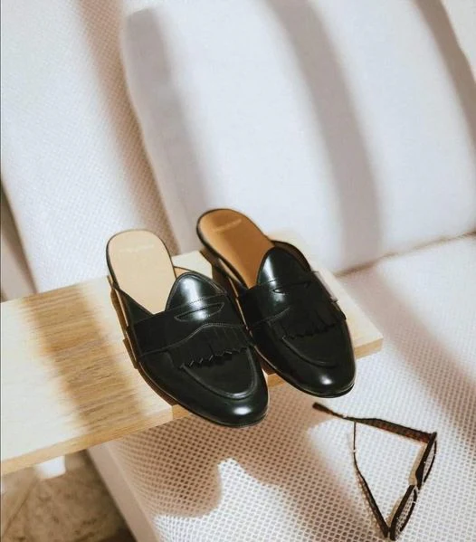 BLACK HAND-POLISHED CALFSKIN BELGIAN STYLE MULES WITH FRINGED BANDS AND TON-SUR-TON GROS-GRAIN PIPING. THE MATTE PATINATION OF THE LEATHER IS HAND-REMOVED WITH QUICK MACHINE BRUSHING AND GIVES THE SHOE A UNIQUE GLOSSY-MATTE EFFECT