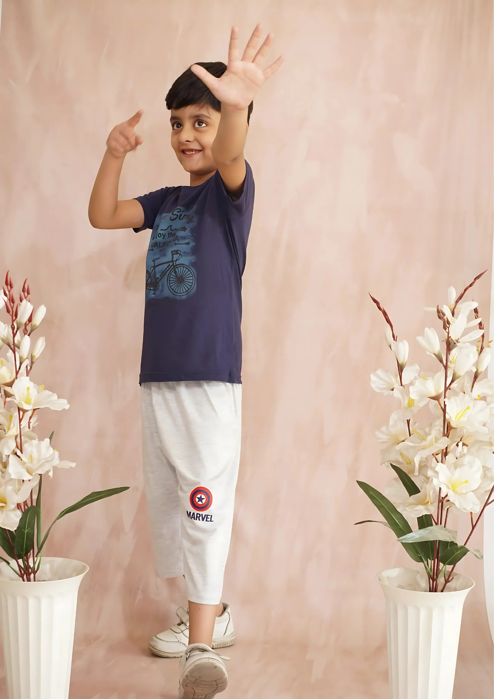 Comfy navy cotton tee with a “Live Simply” California bicycle graphic. Stylish kiddy wear from leading kids’ brands.