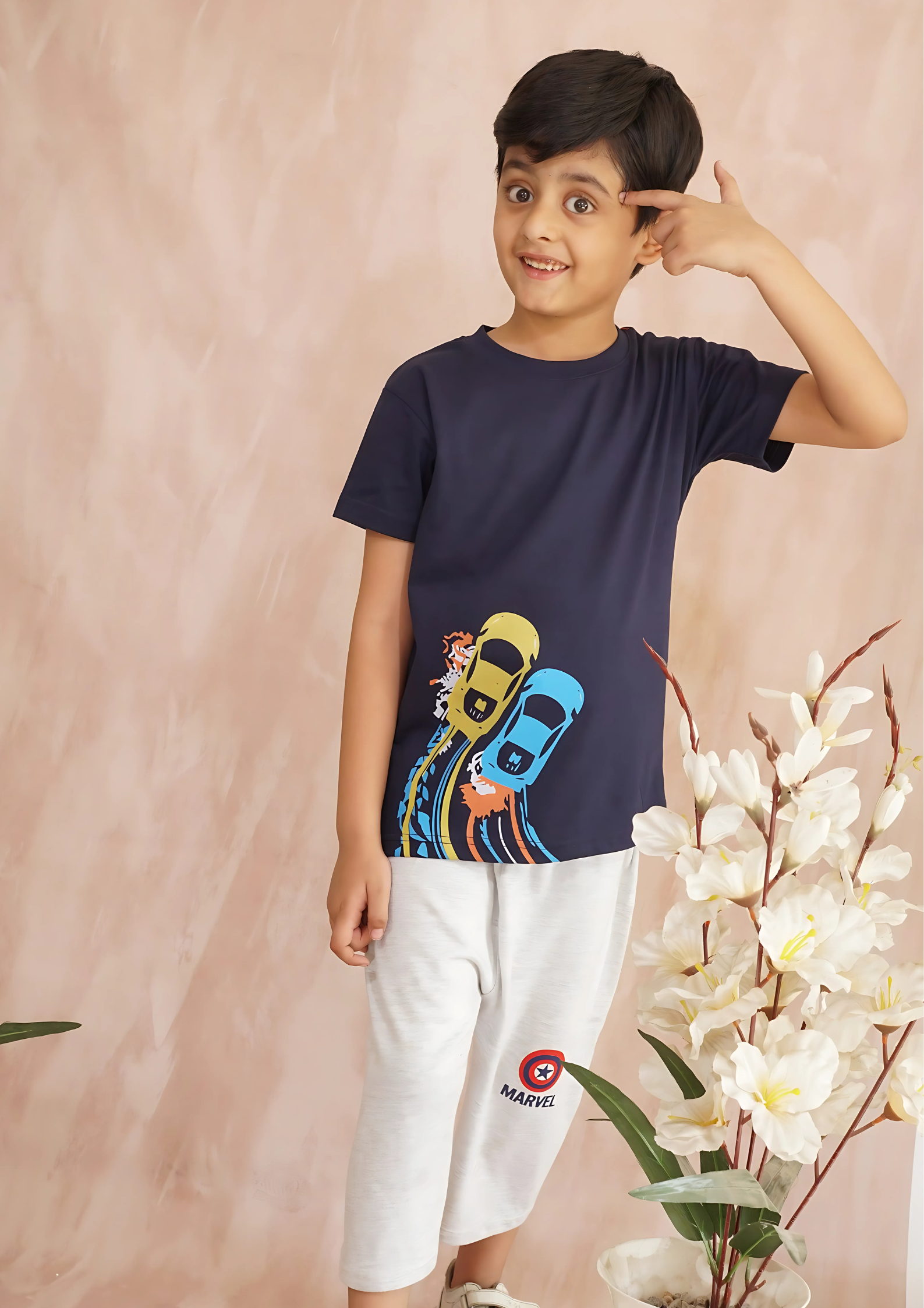 Cool navy blue cotton t-shirt with vibrant racing car graphic. Comfortable kiddy wear from leading kids’ brands….