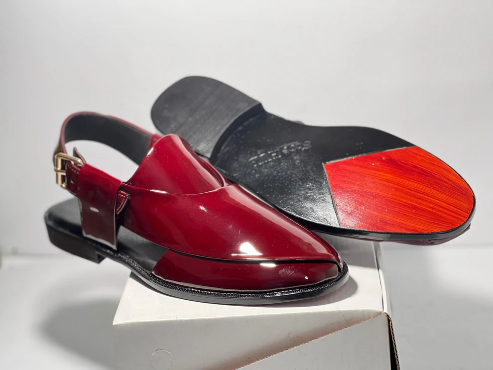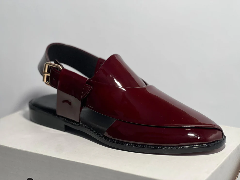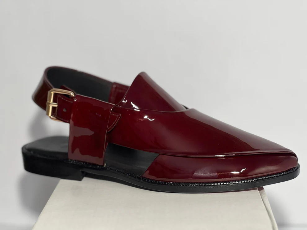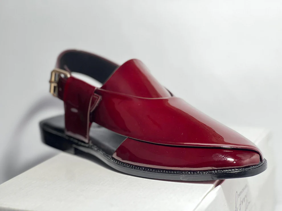 Step into sophistication with this handcrafted leather Peshawari chappal, designed for those who appreciate luxury and tradition. Featuring a stunning deep red patent leather finish, this masterpiece is a modern take on the classic Pakistani Peshawari chappal.